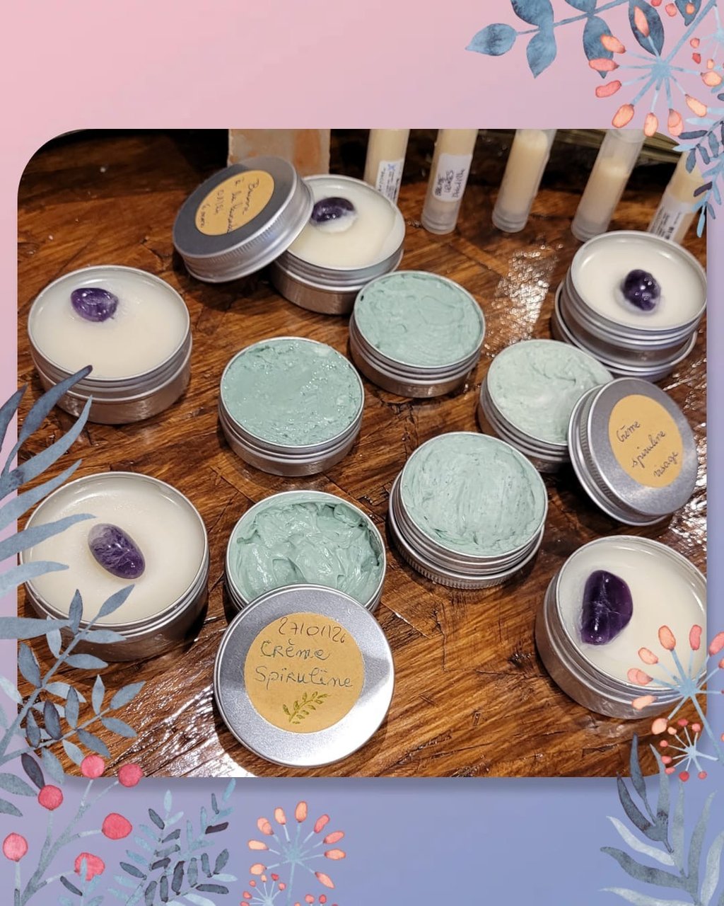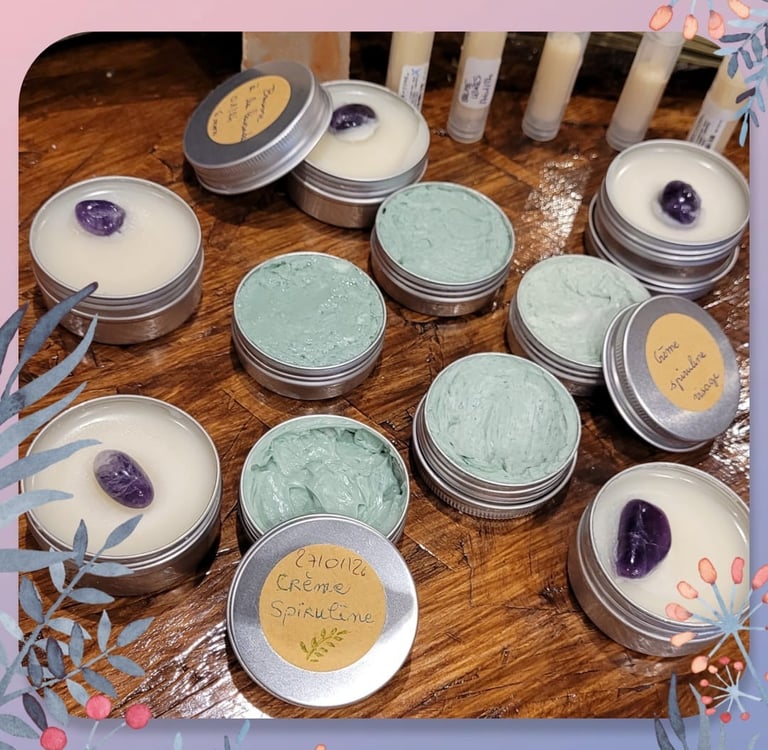 Réalisation de baumes botaniques et vibratoires avec leurs pierres semi- précieuses + Crèmes à la spiruline